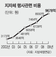 가장 많이 지적되는 것으로 낭비 요소가 큰 전시성 행사 비용의 급증이다. 2002년 3173억원이던 전국 지자체의 행사 관련 비용은 매년 꾸준히 상승해 2009년 9678억원까지 증가했다. 연평균 증가율로 따져도 17.3%다. 반면 지자체 평균 재정자립도는 2005년 57.2%로 정점을 찍은 뒤 계속 하락해 2009년 53.6%로 내려앉았다.