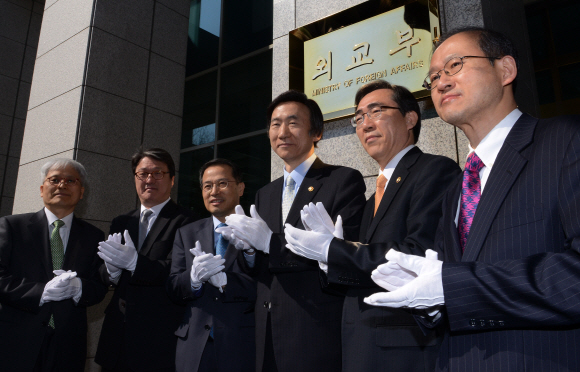 윤병세 외교부 장관이 25일 서울 세종로 도렴동에 있는 정부서울청사 별관에서 부처 명칭 변경에 따른 ‘외교부 현판식’을 마친 후 직원들과 함께 손뼉을 치고 있다. 오른쪽부터 임성남 한반도평화교섭본부장, 조태열 외교부 2차관, 윤 장관, 김규현 외교부 1차관, 김병국 국립외교원장, 조대식 외교부 기획조정실장.