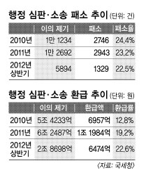 감사원이 국세청 통계를 바탕으로 재구성한 자료에 따르면 2010년부터 2012년 6월까지 납세자가 과세에 이의를 제기한 건수는 2010년 1만 1234건, 2011년 1만 2692건, 2012년 5894건(상반기)이었다. 이 중 납세자가 국가를 상대로 행정심판, 행정소송 등을 진행해 이긴 건수(인용건)는 2010년 2746건, 2011년 2943건, 2012년 상반기 1329건으로 집계됐다. 비율로 보면 24.4%(2010년), 23.2%(2011년), 22.5%(2012년 상반기)로 낮아지는 추세다. 납세자의 과세이의신청을 받아 적정 여부를 판단하는 과세전적부심사제도나 국세청의 과세자문제도가 어느 정도 효과가 있다는 방증이다.