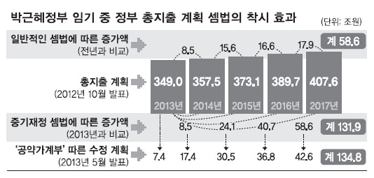 11일 기재부 등에 따르면 지난해 10월 발표된 ‘2012~2016 국가재정운영계획’과 17조 3000억원의 올해 추가경정예산 등을 감안하면 정부 총지출은 2013년 349조원에서 ▲2014년 357조 5000억원 ▲2015년 373조 1000억원 ▲2016년 389조 7000억원 ▲2017년 407조 6000억원(직전 5개년 평균 증가율 4.6% 적용 시) 등으로 늘어난다. 전년 대비를 적용하는 일반적인 셈법으로는 매년 8조 5000억~17조 9000억원 증가해 4년간 총 58조 6000억원이 늘어난다.
