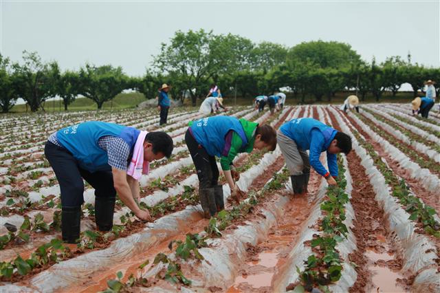 한국전기안전공사 임직원들이 지난 5월 ‘그린홈 그린타운’ 자매결연을 맺은 전북 완주군 이서면 정농마을을 찾아 밭작물 정리 등 농사일을 돕고 있다.<br>한국전기안전공사 제공
