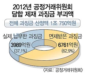 지난해 공정거래위원회가 기업들의 담합 행위를 처벌하면서 매긴 과징금 가운데 63%에 이르는 6700억여원을 각종 명목으로 깎아 준 것으로 드러났다. 과징금 감경 조항에 따라 기업들이 ‘할인’ 혜택을 받은 것으로 감경 기준을 대폭 강화해 법 집행의 실효성을 높여야 한다는 지적이 나오고 있다.