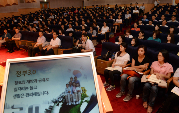 4일 국가기록원 주최로 서울 세종로 정부서울청사 별관에서 열린 ‘2013 기록관리 정보공개 연찬회’에 참석한 기록관리, 정보공개 담당 공무원들이 ‘정부 3.0’에 대한 박찬우 안전행정부 1차관의 강연을 듣고 있다.