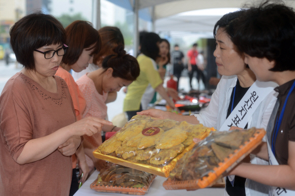 관세청 직원들이 17일 서울 청계광장에서 열린 ‘원산지표시 위반물품 순회 전시회’에서 국산과 중국산 버섯의 차이에 대해 설명하고 있다.