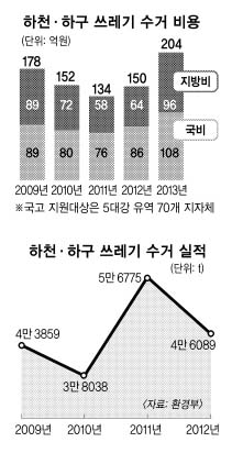 최근 4년간 전국 하천·하구에서 건져 올린 수해 쓰레기 수거량은 한 해 평균 4만 5000여t에 달한다. 환경부는 하천·하구의 원활한 수해 쓰레기 수거를 위해 매년 국고를 지원하고 있다. 올해 한강, 낙동강, 금강, 영산강, 섬진강 등 5대 강 유역 지자체 70곳에 투입되는 예산은 204억원(국고 108억원, 지방비 96억원)이다. 2009년부터 시작된 국고 지원은 광역시는 40%, 도·시·군은 70%로 차등 적용하고 있다.