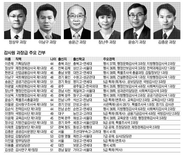 과장 가운데 최고선임인 정상우 재정경제감사국 1과장은 지난해 전략과제감사단 1과장으로 있으면서 원자력발전 부품 계약관리 실태 감사를 주도했다. 올 상반기에는 자유무역협정(FTA) 피해지원금 과다지급 감사를 맡았다. 야전군 사령관 스타일로 감사 경험이 많아 현장 지휘력이 뛰어나다는 평이다. 전윤철 전 감사원장 때는 국공유 재산 관리실태 감사를 통해 정부 재산을 관리·보존만 하는 것이 아니라 수익성을 내는 방향으로 바꿔 정책의 패러다임을 전환했다.