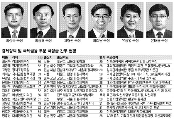 정규돈(52·31회) 협동조합정책관은 부패방지위원회에서 공무원청렴도 평가를 만들고 캐나다 재경관과 통계청 경제통계국장 등을 역임하는 등 다양한 업무를 경험했다. 장호현(54·30회) 국제금융심의관은 정책조정업무를 통해 뛰어난 업무 능력을 검증받았으며 후배들 사이에서 신중한 일처리로 신임을 받고 있다. 정홍상(55·28회) 대외경제협력관은 우리나라 공무원 가운데 처음으로 ADB의 회계 분야 국장으로 임명된 바 있다. 지난해 녹색기후기금을 유치해 호평을 받았다.
