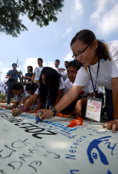 재외동포재단이 주최하는 ‘2013 멕시코 한인 후손 초청연수’에 참가한 멕시코·쿠바 한인 후손들이 19일 경기 파주시 임진각에서 현수막에 평화 통일을 염원하는 글을 쓰고 있다.
