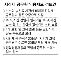 정부는 시간제 일자리 제도를 검토하며 전체 국가공무원의 23.6%가 시간제 근로자인 영국 등의 사례를 참조한 것으로 알려졌다. 영국은 일한 시간에 비례해 본인과 동일한 직급이나 보수등급의 전일제 근무자에 해당하는 기본보수 비율을 적용받는다. 또 전일제와 마찬가지로 초과근무에 따른 초과수당도 받을 수 있다. 안행부 관계자는 “절반만 일하면 승진에서 불리할 수 있기 때문에 시간당 일의 목표에 대한 성과를 측정할 계획”이라고 말했다.