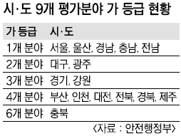 반면 충북은 일반행정·보건위생·지역경제·지역개발·문화관광·환경산림 6개 분야에서 ‘가 등급’을 받았고 ‘다 등급’은 한 건도 없어 성적이 가장 좋았다. 다른 6개 지자체도 4개 분야에서 ‘가 등급’을 받았다.