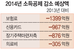 올해부터 신용카드 사용액 소득공제율이 20%에서 15%로 줄어들어 내년에 환급받는 신용카드 소득공제액이 올해보다 967억원 감소한다. 보험료와 의료비 공제금액도 각각 1399억원, 305억원 줄어들고 장기주택마련저축 소득공제(876억원) 제도는 아예 폐지된다.