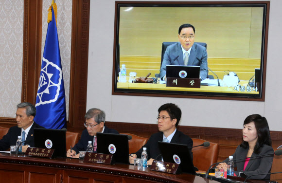 조윤선(오른쪽) 여성가족부 장관 등 국무위원들이 16일 정부서울청사와 세종청사 간 영상국무회의에서 정홍원(뒤쪽) 국무총리의 모두발언을 경청하고 있다.