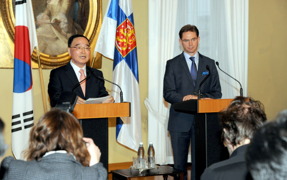 핀란드를 공식방문 중인 정홍원 국무총리가 23일(현지시간) 헬싱키 정부국제회의장에서 이와르키 카타이넨 총리와 회담을 마친 뒤 공동기자회견을 하고 있다.<br><br>헬싱키 연합뉴스