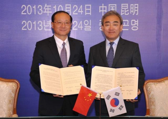 24일 중국 쿤밍에서 열린 한·중 관광장관회담에서 유진룡(오른쪽) 문화체육관광부 장관과 샤오치웨이(왼쪽) 중국 국가여유국장이 ‘한·중 관광품질 향상을 위한 실무협의체 발족·운영에 관한 합의각서’를 들어 보이고 있다.