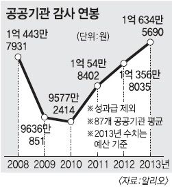 19일 공공기관 경영정보 공개시스템 ‘알리오’에 따르면 올해 공공기관 감사의 평균 연봉은 1억 635만원이다. 2009년 공공기관 방만 경영을 이유로 임원의 임금을 대폭 삭감했던 2009년 9637만원과 비교해 10.4% 증가했다. 임원 임금 삭감 직전인 2008년(1억 444만원) 수준을 넘어섰다.