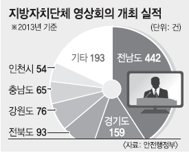 반면 서울시를 비롯한 특별·광역시 8곳에서 열린 영상회의는 총 131회로 12.1%에 불과했다. 안행부 관계자는 “전남도, 강원도 등은 섬 또는 산악 지형이 많은 곳이고, 그에 비해 특별·광역시의 경우는 상대적으로 행정구역 면적이 좁아 자치구와의 영상회의를 많이 활용할 이유가 적기 때문일 것”이라고 설명했다.