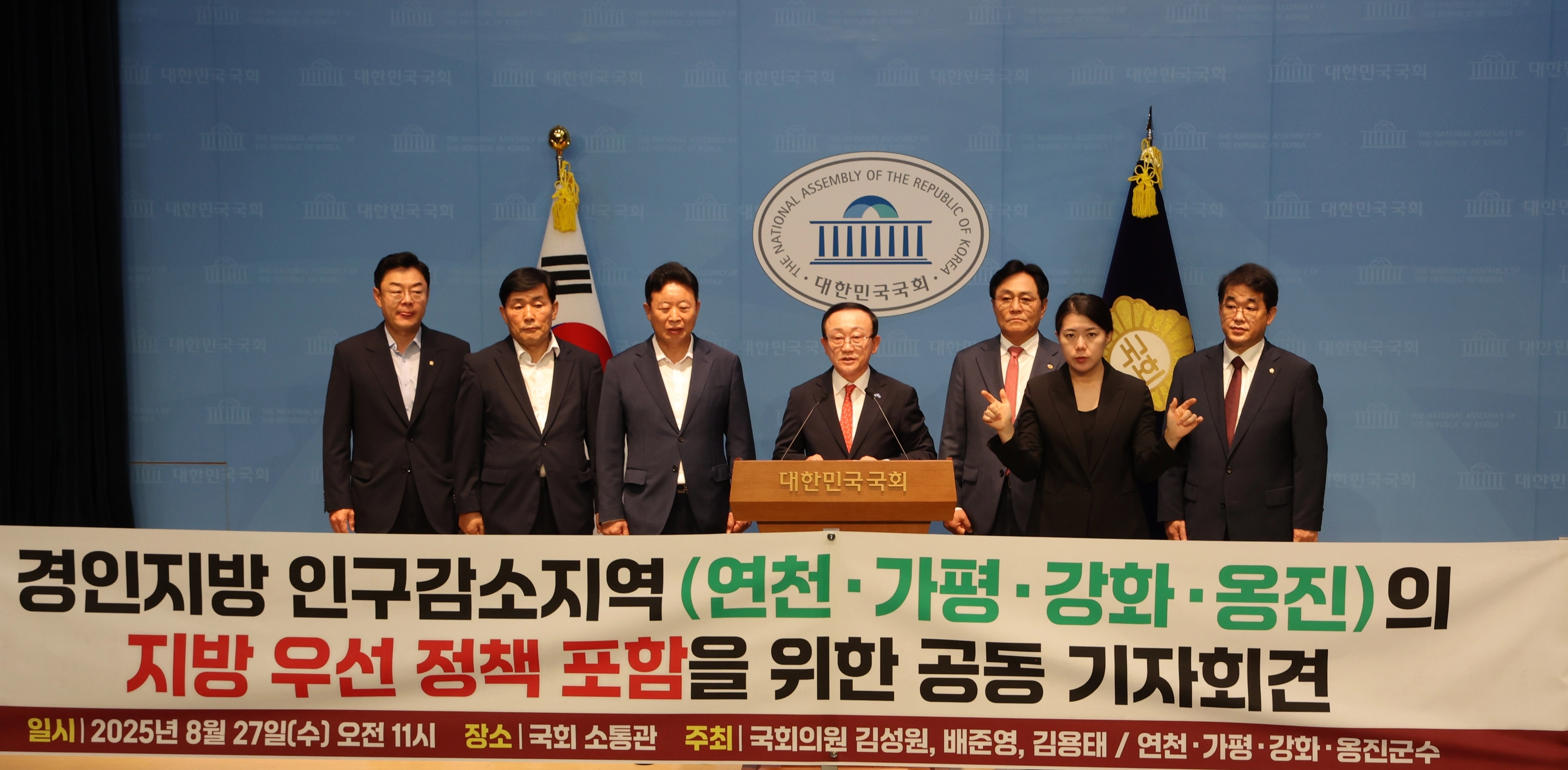 김성원·배준영·김용태 국회의원과 김덕현 연천군수, 서태원 가평군수, 박용철 강화군수, 문경복 옹진군수 등은 27일 국회 소통관에서 공동 기자회견을 열고 정부의 지방 우선 지원정책에 수도권 인구감소 시군을 포함시킬 것을 촉구했다.