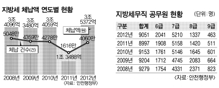 경기 둔화가 길어지면서 지방세수 환경이 당장 좋아지기 힘든 점을 감안, 각 지자체에서는 최근 체납된 지방세 징수를 강화해 세입 여건을 개선하는 분위기다. 지방세 체납액은 연평균 3조원 규모다. 하지만 지방세 체납액 징수 등의 업무를 수행하는 지방세무직 공무원 수는 오히려 줄고 있는 것으로 나타났다.