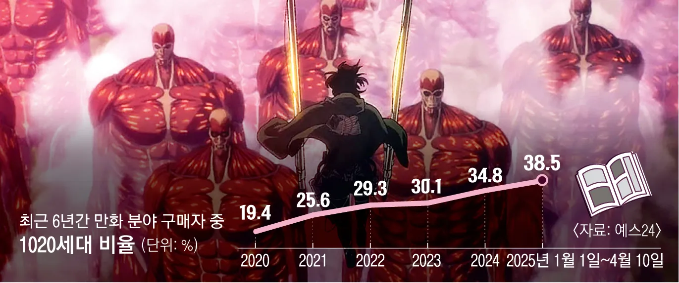 이를 견인하는 1020세대의 만화 구매 비율은 최근 6년간 꾸준히 상승했다. 올해는 5년 전보다 2배 가까이 올라 전체 구매자 3명 중 1명을 차지할 정도다. 권문경 예스24 프로덕트 디렉터(PD)는 “온라인동영상서비스(OTT) 애니의 인기가 급증한 2020년 이후 원작을 찾는 독자가 늘어나는 등 분명한 상관관계를 보인다”고 설명했다.