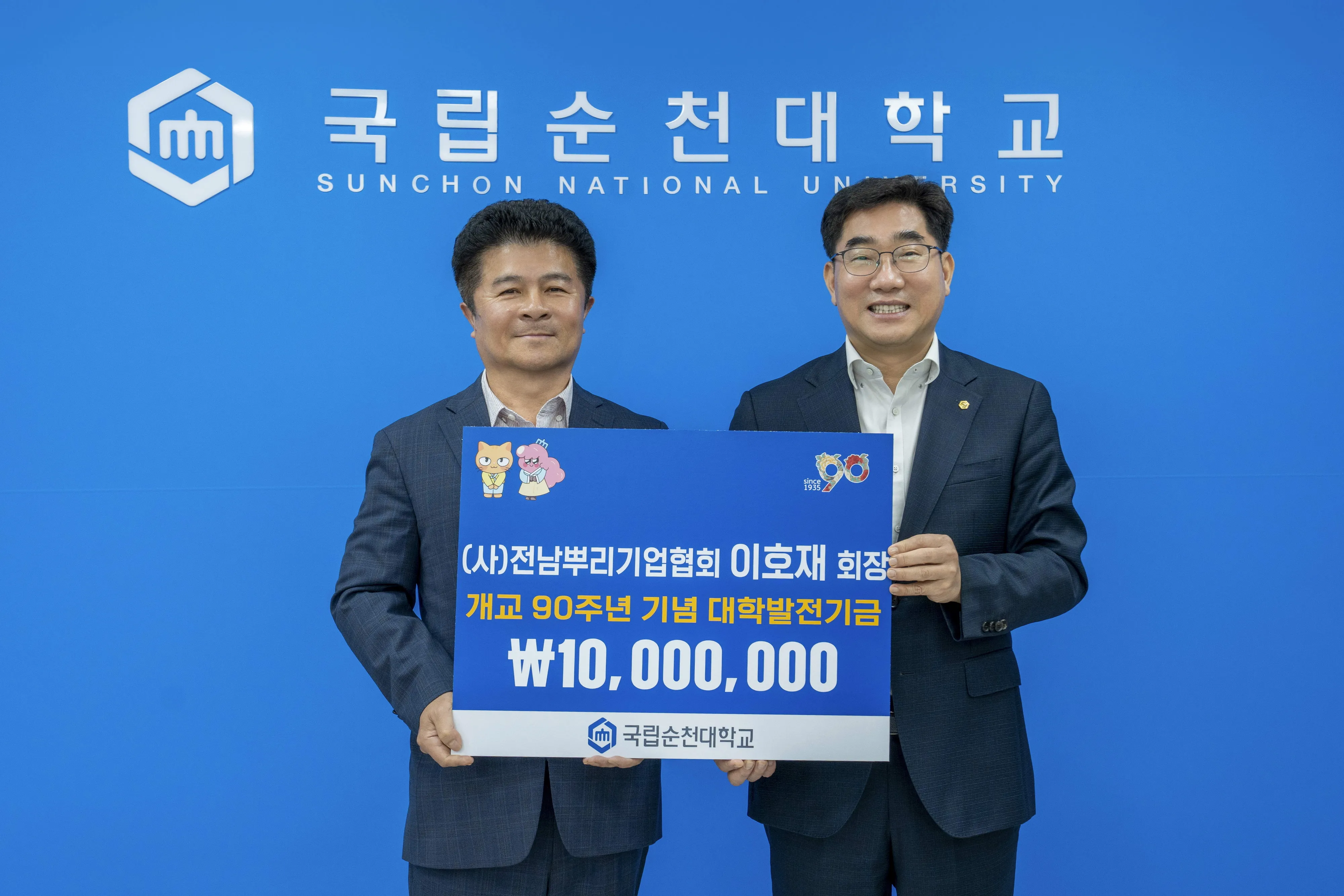 이에 이병운 총장은 “개교 90주년에 특별한 의미를 더해주신 이호재 회장님께 깊이 감사드린다”며 “국립순천대학교는 지역사회와 기업의 신뢰에 부응해 강소기업이 필요로 하는 실무형 인재 양성과 기술 협력 체계를 더욱 강화해 나가겠다”고 화답했다.