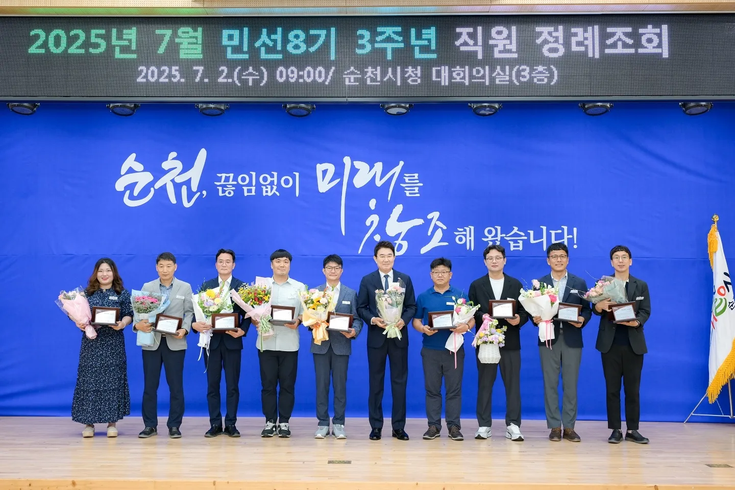 순천시가 지난 2일 7월 직원 정례조회에 앞서 시 직원들을 대상으로 2025년도 상반기 적극행정 우수사례에 대한 시상식을 개최했다