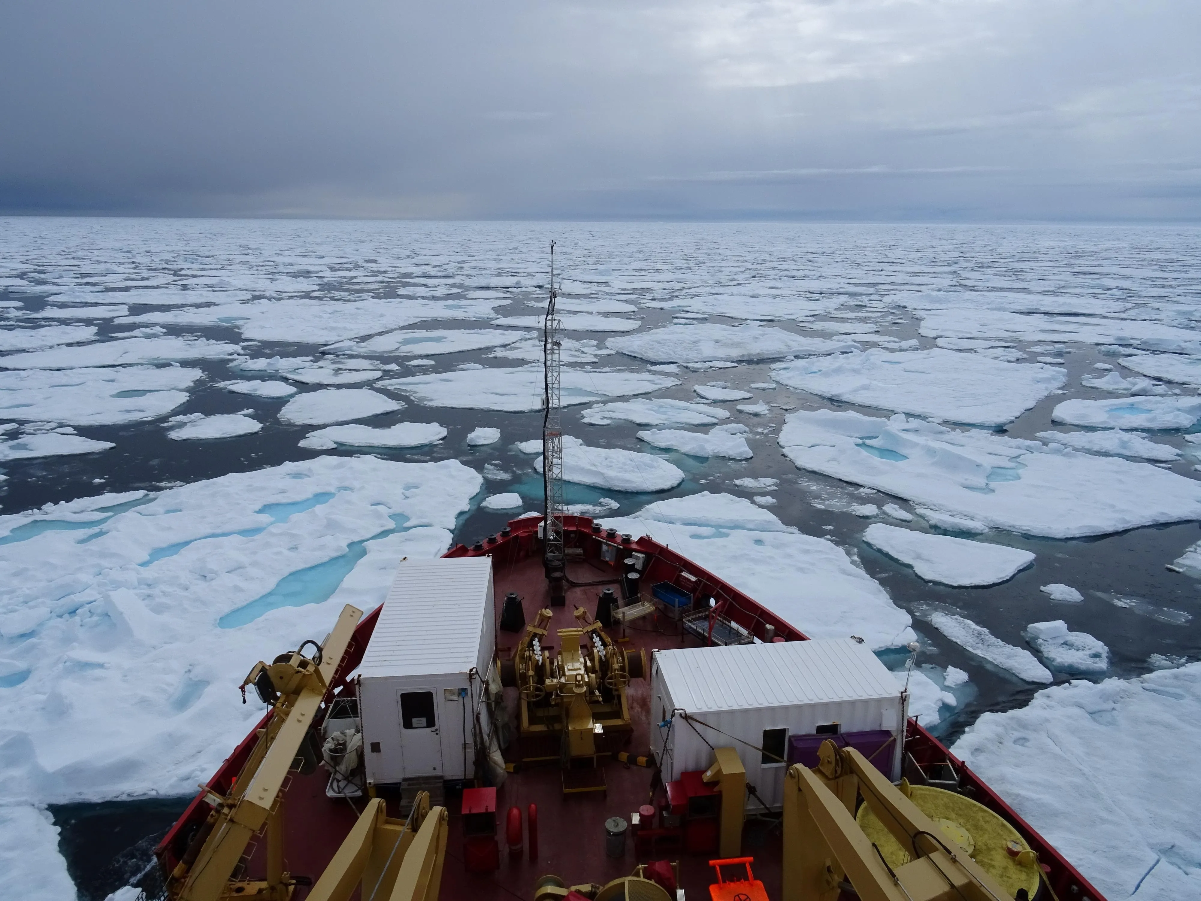 캐나다 해안경비대  순찰선 ‘CCGS 아문센’호가 2017년 7월 바핀만에서 부서진 해빙을 통과하고 있다. 온난화로 인해 북극 얼음들이 녹으면서 북극 항로가 열릴 것으로 기대했지만 예상과 다른 연구 결과가 나왔다.