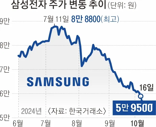 최근 안팎으로 커지는 위기론 속 주가 반등이 시급한 삼성전자가 네덜란드 반도체 장비업체 ASML의 올 3분기 ‘어닝 쇼크’(실적 충격) 여파에 휘말리며 또다시 ‘5만 전자’로 주저앉았다. 글로벌 반도체 공급망에서 ‘슈퍼 을’로 꼽히는 핵심 장비 공급업체인 ASML이 부진한 실적 발표와 함께 내년 실적 전망치도 크게 하향하면서 업계 전반에 먹구름이 짙게 드리우고 있다.