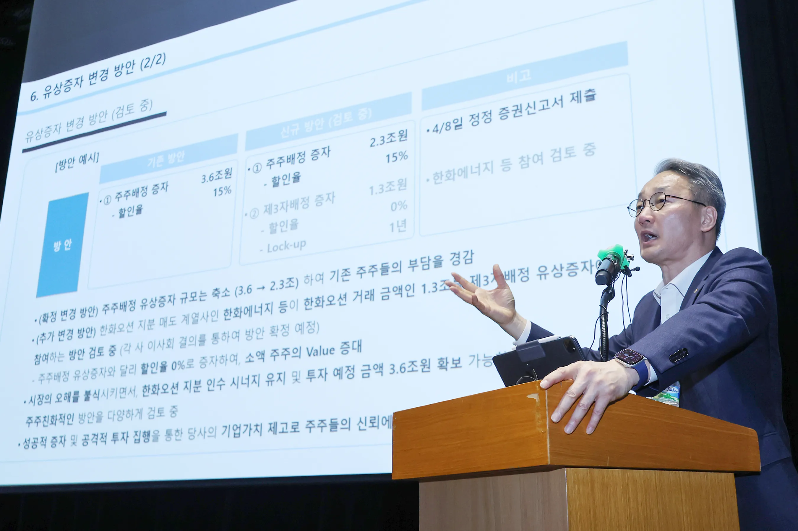 안병철 한화에어로스페이스 전략총괄사장이 8일 서울 중구 한화그룹 본사에서 열린 비전설명회에서 유상증자 규모를 축소한 것에 대해 설명하고 있다. 뉴스1