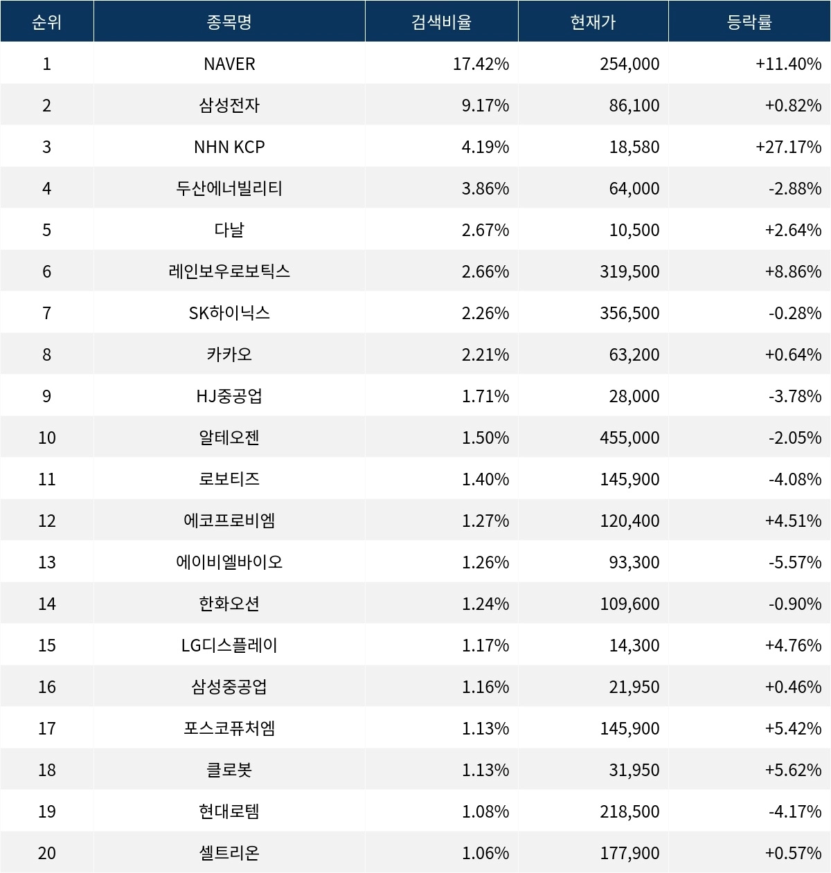 6위 레인보우로보틱스(277810)는 등락률 8.86%로 상승했다. 7위 SK하이닉스(000660)는 -0.28%의 등락률을 기록하며 소폭 하락했다. 8위 카카오(035720)는 0.64% 상승 마감했다. 9위 HJ중공업(097230)은 3.78% 하락했다. 10위 알테오젠(196170)은 2.05% 하락했다.