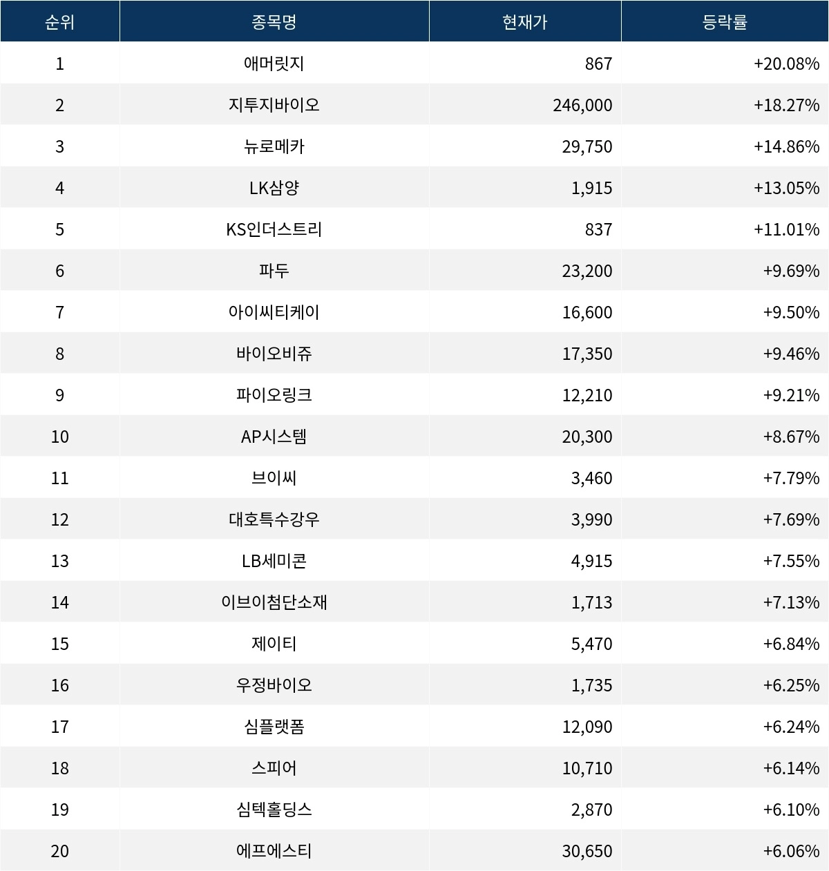 6위 파두(440110)는 현재가 23,200원으로 9.69% 상승 중이다. 7위 아이씨티케이(456010)는 현재가 16,600원으로 9.50% 상승 중이다. 8위 바이오비쥬(489460)는 현재가 17,350원으로 9.46% 상승 중이다. 9위 파이오링크(170790)는 현재가 12,210원으로 9.21% 상승 중이다. 10위 AP시스템(265520)은 현재가 20,300원으로 8.67% 상승 중이다.