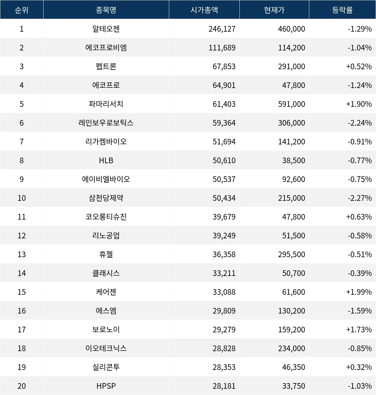 한편, 시가총액 20위권 종목들은 코오롱티슈진(950160)(950160) ▲0.63%, 리노공업(058470)(058470) ▼0.58%, 휴젤(145020)(145020) ▼0.51%, ..., HPSP(403870)(244920) ▼1.03% 등의 성적을 기록하고 있다.