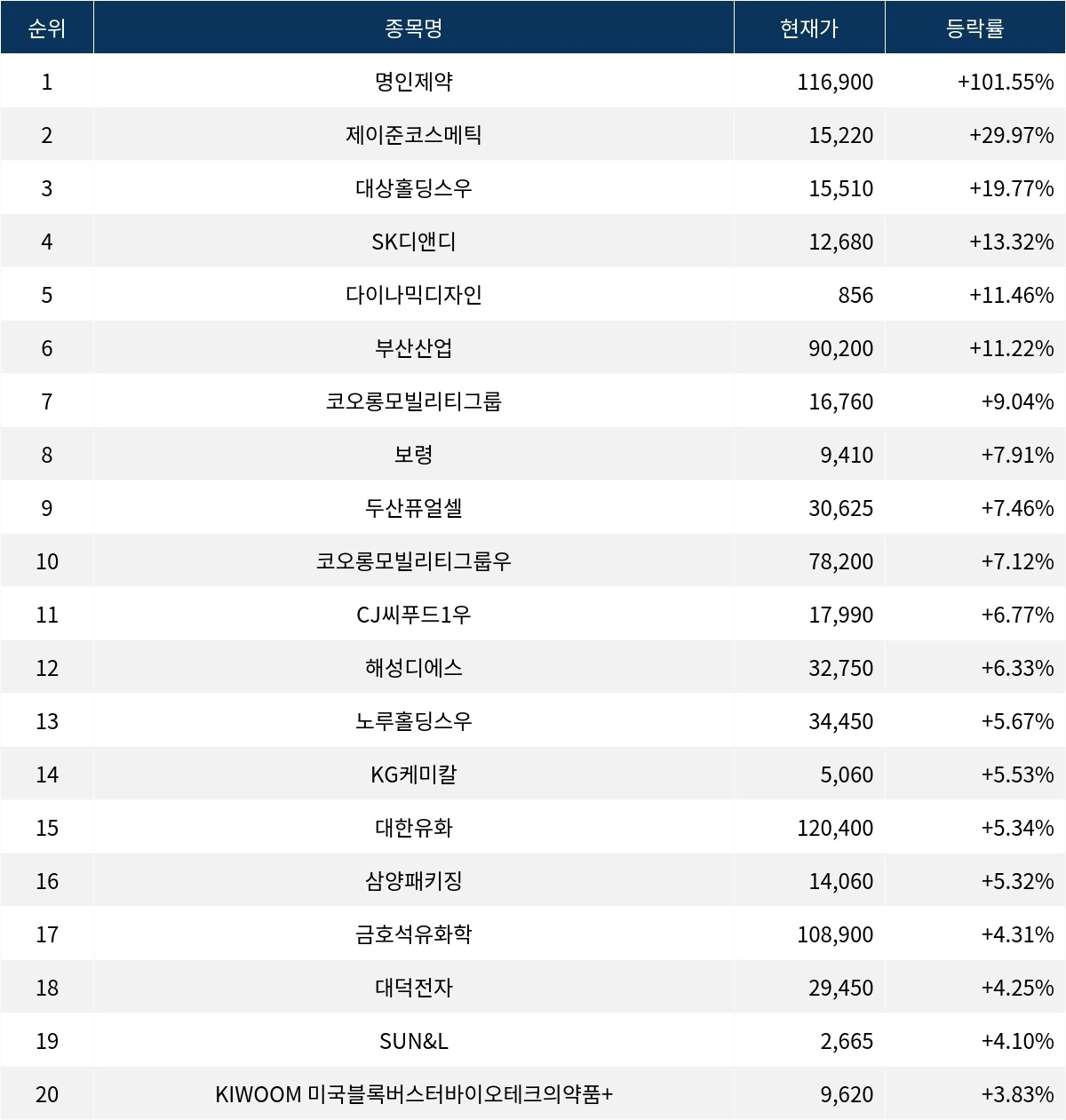 [서울데이터랩]명인제약 101.55% 폭등…실시간 상승률 1위