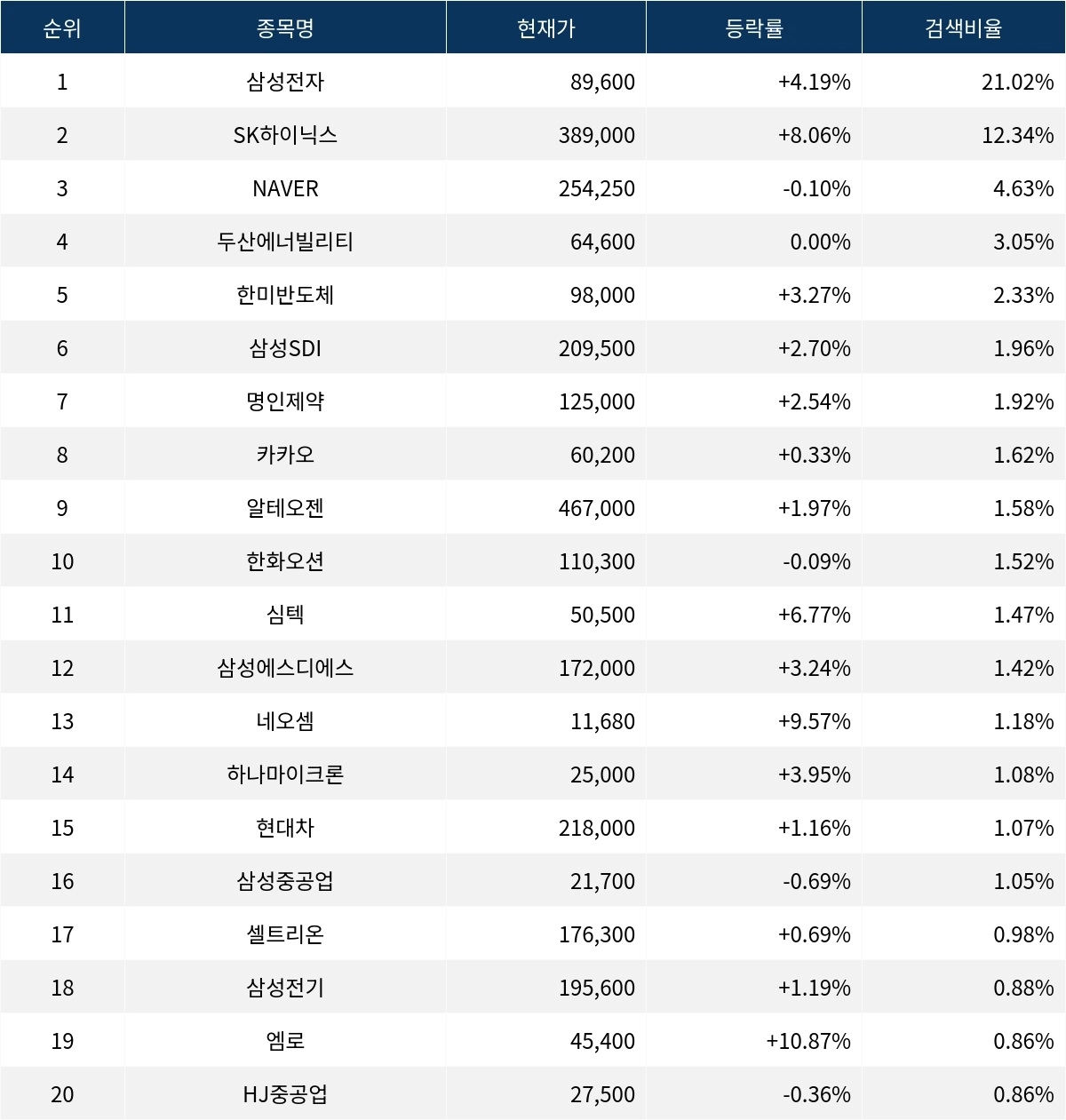 이어 SK하이닉스(000660)가 검색비율 2위를 기록하며 8.06%의 상승세를 기록하고 있다. 검색비율 3위의 NAVER(035420)는 0.10% 하락하며 보합권에 머물고 있다. 검색비율 4위 두산에너빌리티(034020)는 개장 초반부터 0.00%의 등락률로 보합세를 보이고 있다. 검색비율 5위 한미반도체(042700)는 3.27% 상승하며 강세를 보이고 있다.