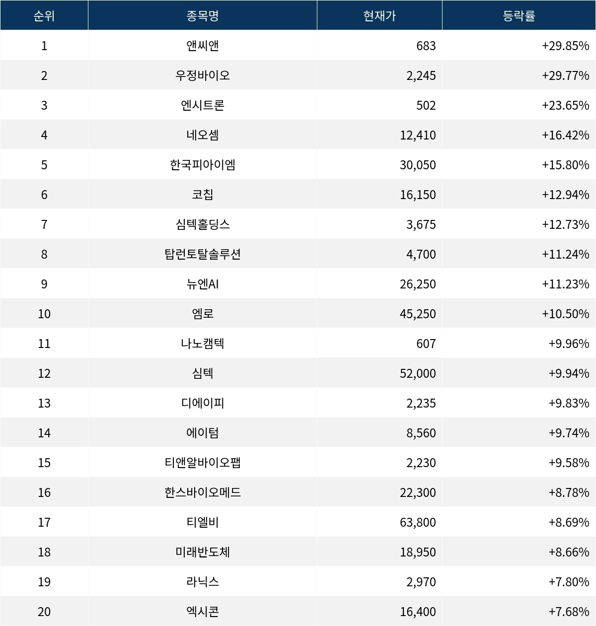이어 상승률 2위 우정바이오(215380)는 현재가 2,245원으로 주가가 29.77% 폭등하고 있다. 상승률 3위 엔시트론(101400)은 현재 502원으로 23.65% 폭등하며 강세를 보인다. 상승률 4위 네오셈(253590)은 16.42% 급등하며 12,410원에 거래되고 있다. 상승률 5위 한국피아이엠(448900)은 15.80%의 상승세를 타고 30,050원에 거래되고 있다.