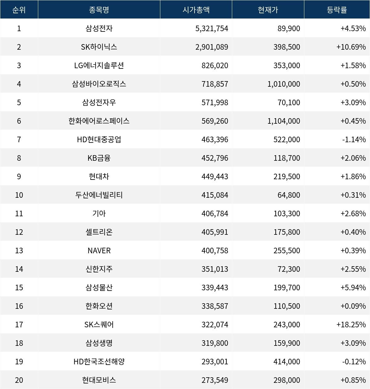 한편 시가총액 20위권 종목들은 기아(000270) ▲2.68%, 셀트리온(068270) ▲0.40%, NAVER(035420) ▲0.39%, 신한지주(055550) ▲2.55%, 삼성물산(028260) ▲5.94%, 한화오션(042660) ▲0.09%, SK스퀘어(402340) ▲18.25%, 삼성생명(032830) ▲3.09%, HD한국조선해양(009540) ▼0.12%, 현대모비스(012330) ▲0.85% 등의 성적을 기록하고 있다.