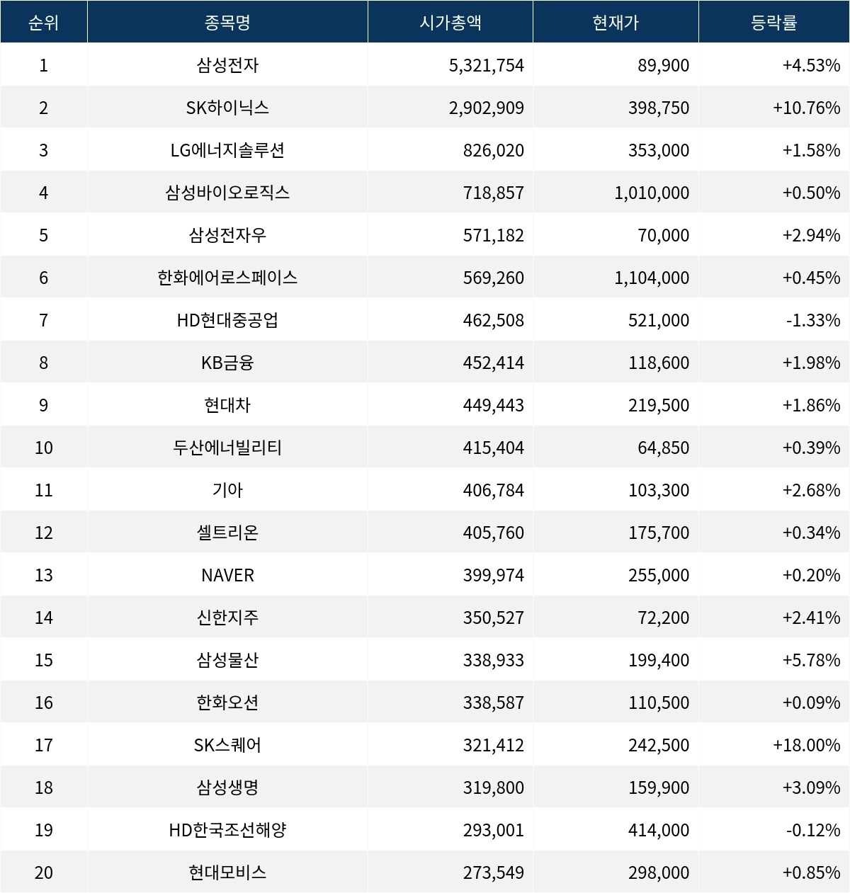 2일 오후 12시 20분 한국거래소에 따르면, 시가총액 1위인 삼성전자(005930)는 현재가 89,900원으로 전 거래일 대비 4.53% 상승 중이다. 상장주식수 5,919,638주에 외국인비율이 51.52%로, 이 종목은 PER 20.08, ROE 9.03을 기록하며 안정적인 재무 지표를 유지하고 있다. 반도체 대장주인 SK하이닉스(000660)는 398,750원으로 10.76% 급등하며, 거래량 4,832,094주를 기록하고 있다. 외국인비율이 55.48%에 달하며, PER 10.06, ROE 31.06으로 재무 상태가 양호하다.
