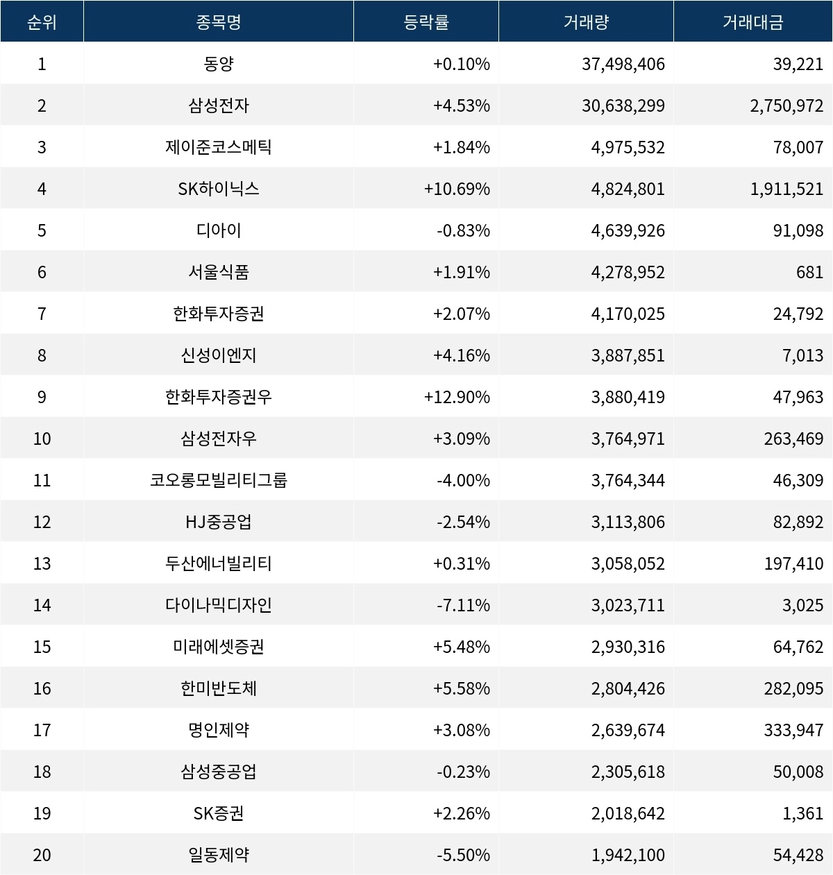 한편, 거래량 3위인 제이준코스메틱(025620)는 4,975,532주가 거래되며 현재가 15,500원, 등락률은 +1.84%에 머무르고 있다. 이어서 SK하이닉스(000660)는 10.69% 상승하며 4,824,801주가 거래되고 있으며, 디아이(003160)는 4,639,926주의 거래량을 기록하며 -0.83% 하락하고 있다. 서울식품(004410), 한화투자증권(003530), 신성이엔지(011930), 한화투자증권우(003535), 삼성전자우(005935)가 각각 거래량 상위 10위권에 이름을 올리고 있다.