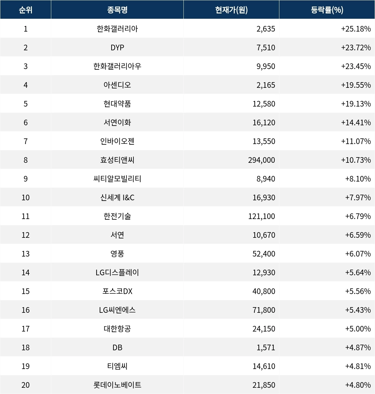 이어 상승률 2위 DYP(092780)는 현재가 7,510원으로 주가가 23.72% 폭등하고 있다. 상승률 3위 한화갤러리아우(45226K)는 현재 9,950원으로 23.45% 폭등하며 강세를 보이고 있다. 상승률 4위 아센디오(012170)는 19.55% 급등하며 2,165원에 거래되고 있다. 상승률 5위 현대약품(004310)은 19.13%의 상승세를 타고 12,580원에 거래되고 있다.