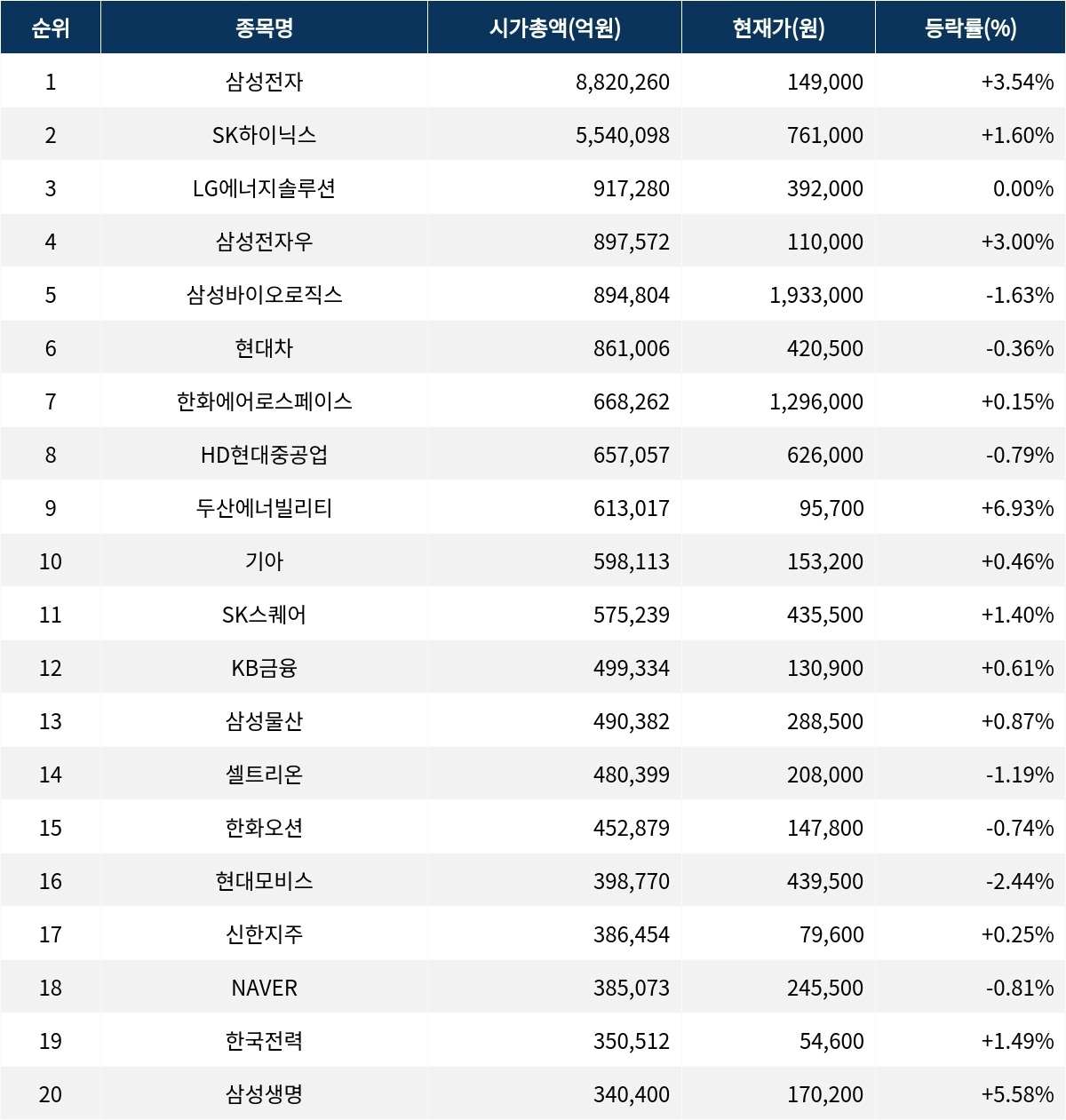 한편 시가총액 20위권 종목들은 SK스퀘어(402340) ▲1.40%, KB금융(105560) ▲0.61%, 삼성물산(028260) ▲0.87%, 셀트리온(068270) ▼1.19%, 한화오션(042660) ▼0.74%, 현대모비스(012330) ▼2.44%, 신한지주(055550) ▲0.25%, NAVER(035420) ▼0.81%, 한국전력(015760) ▲1.49%, 삼성생명(032830) ▲5.58% 등의 성적을 기록하고 있다.