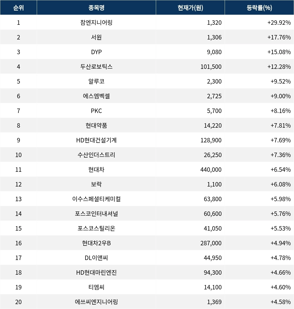 6위 에스엠벡셀(010580)은 현재가 2725원으로 9.00% 상승 중이다. 7위 PKC(001340)는 현재가 5700원으로 8.16% 상승 중이다. 8위 현대약품(004310)은 현재가 1만 4220원으로 7.81% 상승 중이다. 9위 HD현대건설기계(267270)는 현재가 12만 8900원으로 7.69% 상승 중이다. 10위 수산인더스트리(126720)는 현재가 2만 6250원으로 7.36% 상승 중이다.