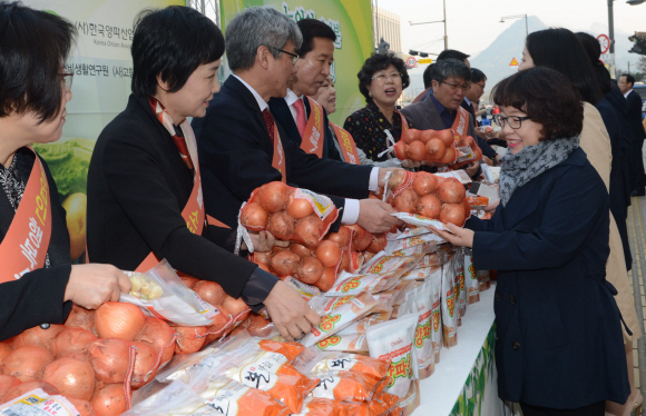 최원병(왼쪽에서 네 번째) 회장 등 농협중앙회 임직원들이 2일 서울 지하철5호선 광화문역 5번 출구 앞에서 출근하는 직장인을 대상으로 우리 농산물 소비 촉진 캠페인을 벌이며 양파 등을 나눠 주고 있다.