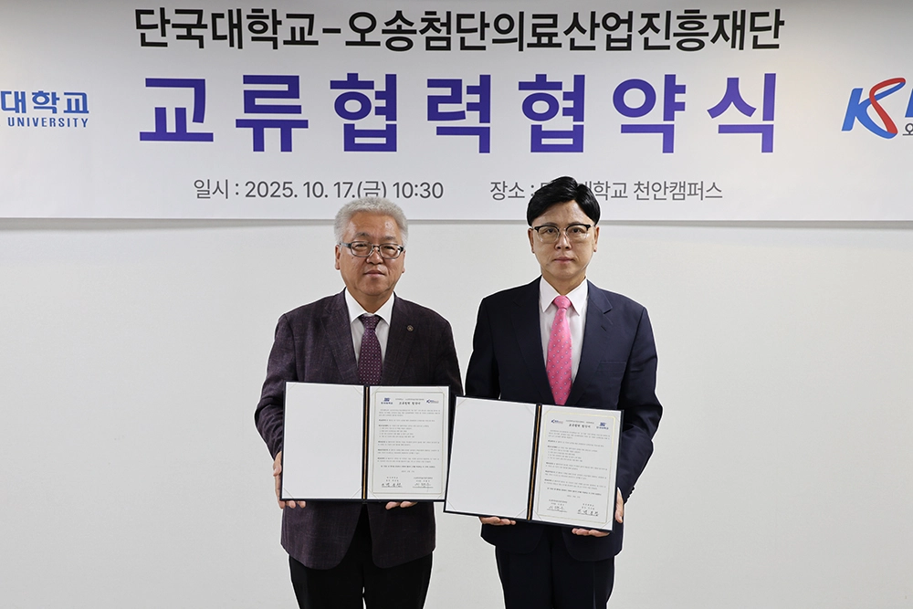 단국대학교(총장 안순철)는 17일 천안캠퍼스에서 오송첨단의료산업진흥재단(KBIOHealth, 이사장 이명수)과 의료산업 분야 인재 양성을 위한 업무협약을 체결했다.