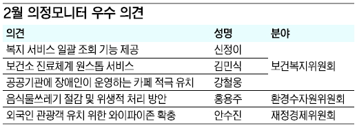 서울신문과 서울시의회가 함께하는 2월 의정모니터에는 요원들의 의견 92건이 접수됐다. 직접 현장을 돌아다니며 발굴한 개선 아이디어는 시정에 반영될 수 있도록 서울시와 산하기관에 전달했다. 그중 심사를 통해 5건이 우수 의견으로 선정됐다.