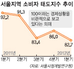 이는 2009년 1분기(78.3) 이후 가장 낮은 수준으로, 최근 5분기 잇달아 기준치 100을 넘어서지 못했다. 이 수치가 100 이상이면 시민이 경제 상황을 낙관적으로 보고 있다는 뜻이고, 100 이하면 반대다. 박희석 시정연 연구위원은 “경기회복에 대한 기대감이 불투명하고 물가상승 압력이 지속되는 점을 고려할 때 소비심리가 쉽게 개선되지 않을 것”이라고 내다봤다.