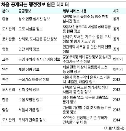 서울시가 시민생활의 편의를 위해 그동안 한번도 공개하지 않았던 내부용 행정정보 원문 데이터를 공개한다.서울시는 2014년까지 교통과 환경, 문화관광, 도시관리, 보건, 주택 등 157종 1200여개의 행정정보 원문 데이터를 단계적으로 공개한다고 12일 밝혔다.