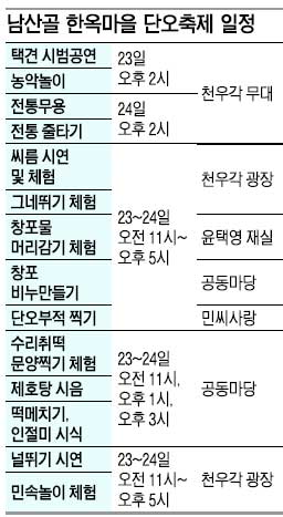 서울시는 23일과 24일 중구 필동2가 남산골한옥마을에서 ‘남산골 단오 축제’를 개최한다고 21일 밝혔다.