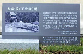 서울시사편찬위원회에서 1981년에 발간한 ‘동명연혁고 성동구 편’에 따르면 왕좌봉은 동명초등학교 내에 있었던 야산 봉우리로 조선 태조 이성계가 무학대사와 함께 이곳에 앉아 도읍지를 정하기 위해 서울의 지형을 살펴봤다고 한다. 또 태조가 이 봉우리에 올라 말 기르는 것을 관찰했다고도 전해진다.