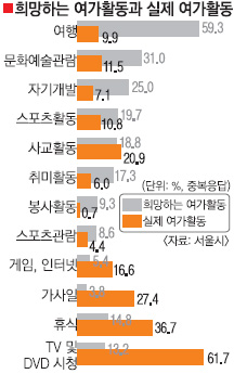 서울 시민들이 희망하는 여가생활로 ‘여행’을 가장 많이 꼽았지만 실제로는 ‘TV 시청’ 등을 하며 여가를 보내는 것으로 나타났다.