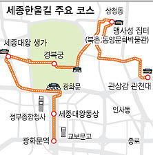 세종한울길의 ‘한’은 크고 바르다는 의미이며 ‘울’은 우리의 터전을 뜻하는 고유어다. 따라서 세종한울길은 세종대왕의 숨결이 살아있는 우리의 터전이라는 뜻이 된다. 코스는 ▲세종벨트 통합 티켓팅 인포센터 ▲세종대왕 동상 ▲광화문광장 세종 이야기 홍보관 ▲세종대왕 생가터 ▲경복궁 ▲맹사성 집터(북촌 동양문화박물관) ▲관상감 관천대로 구성돼 있다.