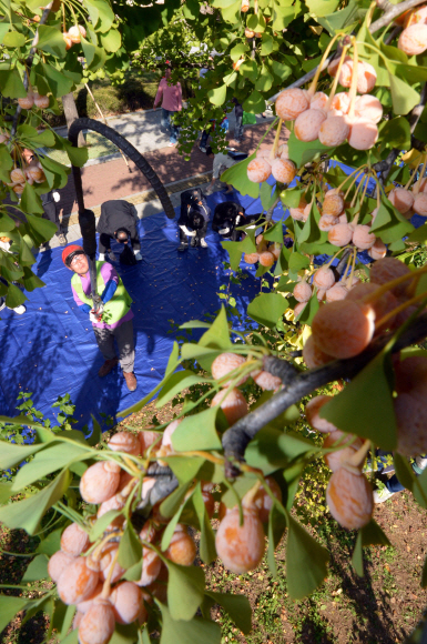 11일 송파구 위례성 대로변에서 한 구청 직원이 다 익은 은행을 따고 있다. 은행 따기에는 구청 직원과 주민 등 200여명이 참가했고 딴 열매는 다음 달 노인정 등 사회복지시설에 기부할 예정이다.